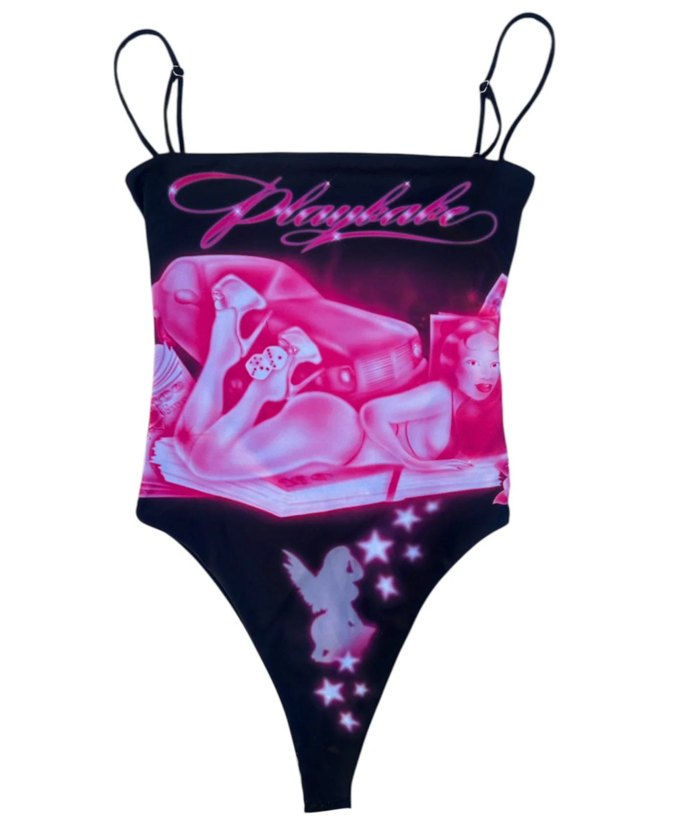 Stretch Cotton lycra jersey blend body with digitally printed bunny motif. Contrast deadstock stripey knit sleeves with scoop back and two adjustable ties.